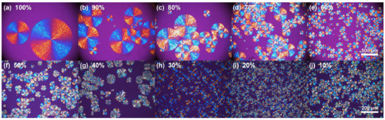 Polarized optical microscopy images of PEO/urea/thiourea IC spherulites crystallized from the melt at the isothermal crystallization temperature of 70 °C with gradual mass fraction of urea in urea/thiourea from 100% to 10%. The scale bar is 500 μm in (a–e), and 200 μm in (f–j).