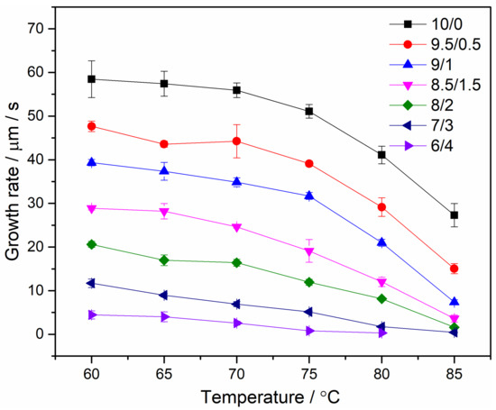 Radial growth rates of PEO/urea/thiourea IC spherulite with different urea/thiourea mass fraction (from 10/0 to 6/4) varying with the isothermal crystallization temperatures from 60 °C to 85 °C.