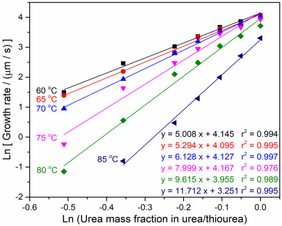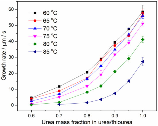 Radial growth rates of PEO/urea/thiourea IC spherulites measured by POM varying with the urea mass fraction in urea/thiourea at the isothermal crystallization temperature ranging from 60 °C to 85 °C.