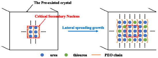 According to our previous research results, the critical secondary nucleus of PEO/urea IC consists of 3 to 9 urea molecules when the crystallization temperature ranges from 65 to 85 °C [17]. The number of urea molecules in the critical secondary nucleus of the three-component PEO/urea/thiourea IC is similar to that of the two-component IC of PEO/urea, confirming that only the urea molecules are selected to form the critical secondary nuclei with EO repeating units. In other words, the nucleation ability of urea molecules to form an inclusion compound with ethylene oxide units is stronger than thiourea molecules, so the selection of urea molecules occurs at the secondary nucleation stage. At the later lateral spreading growth stage used to complete the growth of each layer on the growth front, EO, urea, and thiourea can co-crystallize together. The diagrammatic sketch of the above microscopic process is drawn in Figure 7. Because the secondary nuclei only take a tiny percentage in the samples, X-ray diffraction could not detect the existence of the segregated PEO/urea IC nuclei. A larger size in the critical secondary nucleus compared with the PEO/urea system is probably caused by the more difficult diffusion of urea molecules in the melt in the presence of thiourea.