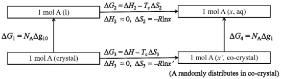 The next step is to find the quantitative relation between Δgi and the composition in the system. We define x’ as the volume fraction of component A in the critical secondary nucleus consisting of n1* A molecules and n2* B molecules, and x’ is approximately equal to the molar fraction n1*/(n1* + n2*). Considering that the mixing of A and B in the melt is homogeneous at the molecular level, and A molecules and B molecules randomly distribute in the critical secondary nucleus, which brings the entropy of mixing to the critical secondary nucleus, and assuming that the enthalpy of mixing A and B is zero in both the melt and co-crystal nucleus (due to the similarity between the urea and thiourea molecules when they form co-crystals in this work), the equivalent thermodynamic process is shown in Scheme 1 to calculate the absolute value of Δg1, the Gibbs free energy change of one A molecule (or entity). Equation (5) is deduced from the equation ΔG1 + ΔG2 = ΔG3 + ΔG4 in Scheme 1, and a similar analysis can be used to deduce Equation (6).