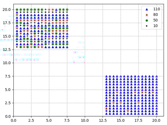 The two regions with different distribution in a feature map. The x-axis and y-axis denote the position of the feature values. The dots with different colors are the feature values. To be specific, the blue, red, green, and black dots are the values of 110, 80, 50, and 10, respectively.