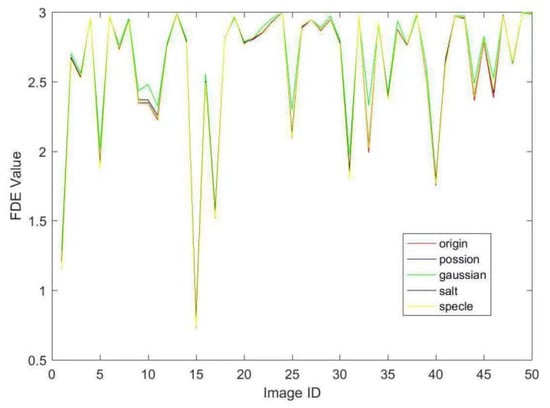The feature distribution entropy (FDE) curve of 50 images applied four kinds of noise. The x-axis represents the image ID and y-axis denotes the values of FDE. The red curve is the FDE values of original images. The other four curves denote the FDE values of the same images with Poisson, Gaussian, salt, and speckle noise, respectively.