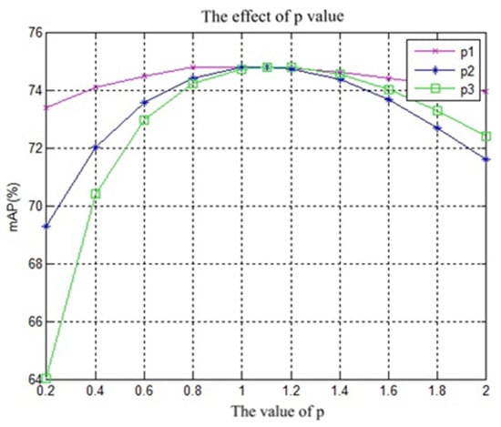 We could conclude that the three curves are convex function, which increase and then decrease monotonously. Figure 4 shows that is most sensitive to the values of mAP. The maximum values are obtained at 1.0, 1.1, and 1.1, respectively. We set the equal to 1.0, 1.1, and 1.1, respectively, in the rest of the experiments.