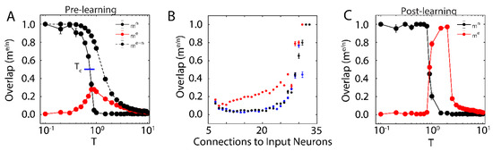 with again being represented by Equation (1). We ran the simulation in the presence of a fixed external field applied to all neurons with learning (a pre-learning phase followed by a learning phase), followed by an additional phase with and then subsequently calculated the difference in the final overlap between the new and the native memory. We found that the system only consolidates the new configuration given sufficiently high external field strength, and only near the critical temperature (Figure 2B). Hence, the system is able to adapt to the new configuration, regardless of its source, only near the critical regime, in support of previous studies [43]. Importantly, higher field magnitude increases the range of temperatures for which the new memory is consolidated (top of Figure 2B).