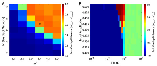 We next investigated how the consolidation depends on the number of input neurons, i.e., the size of , and the magnitude of the weight of the connections stemming from the input (Equation (4)). We varied both of these parameters and monitored maximal change in magnitude of new-state overlap from pre-learning (as exemplified on Figure 1A) to post-learning (Figure 1C). These results are presented in Figure 2A and one can observe that the number of input neurons can be as small as 4% of the total network size to observe meaning full change in the overlap over the rest of the network. Conversely the can be as low 2.3 to observe increase of the overlap. Hence, even weak and sparse input can have noticeable impact on network dynamics, but only near criticality. The asterisk represents the parameter configuration used to generate results presented on Figure 1.