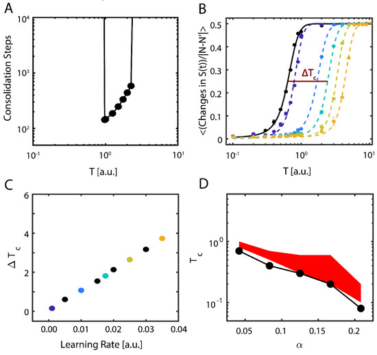Next, we examined how changes to the learning rate ( in Equation (6)) affects both the consolidation of the external input representing the new configuration and the dynamical properties of the system. To assess the transition point (i.e., ), we measured the network’s configuration stability, , as a function of temperature for different values of . Stability here is defined as the mean number of changes from active (+1) to quiescent (−1) states occurring in the network for fixed simulation length; the expected number of these activity changes is 0 in the sub-critical regime and ~N/2 in the super-critical regime, due to Equation (2). We subsequently fit sigmoidal functions to the transition numbers as a function of temperature, taking the form , where the slope μ represents the change in stability due to changing regime and we designate , the temperature where the transitions reach their half-maximum value, as a proxy for critical temperature (Figure 3B); as previously mentioned, is thus an order parameter of the system. We next calculated the change in the critical temperature due to learning, , and found that consolidation of new information shifts the stability, and therefore the critical regime, of the system approximately linearly with the learning rate (Figure 3C).