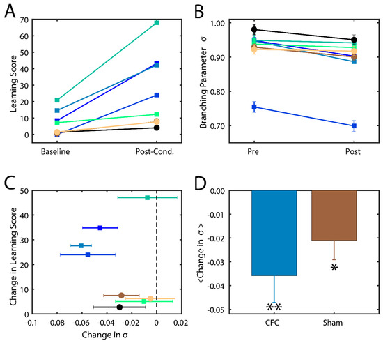 Branching parameter and its changes as a function of quality of memory consolidation during SWS sleep. (A) Percentage of freezing behavior observed in mice before (baseline) and after learning (post-cond.) for sham (circles) and CFC (squares) groups. Different colors represent different mice. (B) Branching parameters σ during SWS before (baseline) and after learning (post-cond.). Colors and shapes are conserved as in (A). Error bars represent the standard error of the mean, calculated for each mouse over all intervals. (C) Change in freezing behavior vs change in branching parameter across the learning interval. Error bars represent the propagation of standard errors between Pre and Post in (B). (D) Mean change in branching parameter within each group. Error bars represent the standard error of the mean. * p < 0.10 confidence interval that the reduction was significant; ** p < 0.02 confidence interval that the reduction was significant, using the one-way T test.