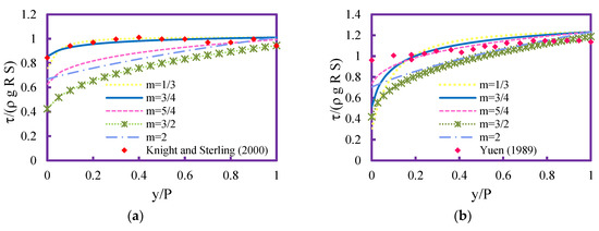 Step 5. Derivation of shear stress distribution: The determination of the entropy index is obtained through calculation of shear stress distribution based on various values from 1/3 to 3 as presented in Figure 1. The calculated shows that the parameter significantly influenced the magnitude of shear stress distribution. Using , the predicted is not close to the experimental data and by lowering the values for entropy index were able to estimate better agreement to experimental data. Although m = 1/3 presented good results, m = 3/4 fitted the observations best in both figures. Therefore, the entropy index value was selected as 3/4.