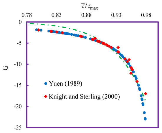 In Equation (21), the Lagrange multipliers are replaced with the dimensionless entropy parameter permitting the value of shear stress with only one . Parameter can be used as the uniformity indicator of , corresponding to the maximum shear stress. Since the Lagrange multipliers are related to mean and maximum shear stress and parameter is related to Lagrange multipliers, then we can obtain a relationship between and . The value of G calculated based on Equation (20) is permissible by solving the Lagrange multipliers using Equations (10) and (11). The calculated is then plotted against the relative mean shear stress and maximum shear stress (.), here shown in Figure 2.