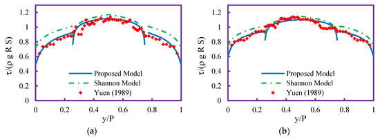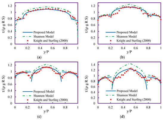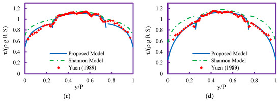 Figure 4 shows the shear stress distribution prediction by the proposed and Shannon models in the wetted perimeter of a trapezoidal channel in different flow conditions. In all cases, the predictions of the proposed model by Sterling and Knight [25] of the wall and bed shear stress are higher than the predictions by the proposed model. The performance of the Shannon model in predicting the shear stress distribution is decreased with increasing flow depth (Figure 4d). As seen in Figure 4, both models presented good performance, but the proposed model predictions are closer to the experimental data of Yuen [5] than the Shannon model. By comparing Figure 3 and Figure 4, it can be deduced that the proposed models’ performance in estimating shear stress distribution along the wetted perimeter in trapezoidal channels is higher than a circular channel with flat bed.