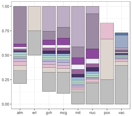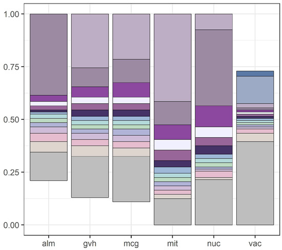 Attribute intervals for the yeast data set discretized by the internal discretization mechanism of C4.5.