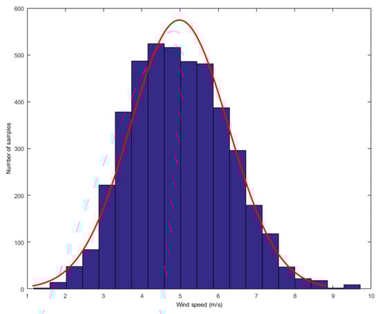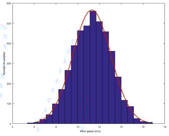 In order to analyze the mixture noise characteristics of wind speed forecasting error, we collected wind speed dataset from Heilongjiang, China. The dataset consists of one-year wind speed data, recording the wind speed values every 10 min. We first found the Gauss-Laplace mixture noise in the above data. The researchers have found that turbulence is the major cause of the wind speed’s strong random fluctuation uncertainty. From wind energy perspective, the most striking characteristic of the wind resource is its variability. Now we display the distributions of wind speed. We obtain a value for wind speed after every 10 min and compute the histograms of wind speed in one or two hours. Two typical distributions are given as follows: one was computed when the wind speed was higher and the other was computed when the wind speed was lower, as shown in Figure 2 and Figure 3, respectively.