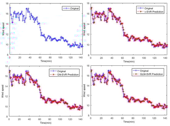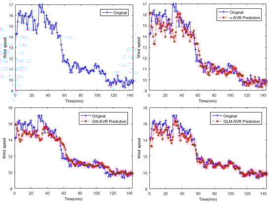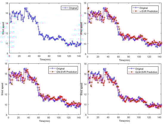 In Figure 5, Figure 6 and Figure 7, the results of wind speed prediction at the point for models -SVR, GN-SVR, and GLM-SVR are obtained after 10 min, 30 min, and 50 min, respectively.