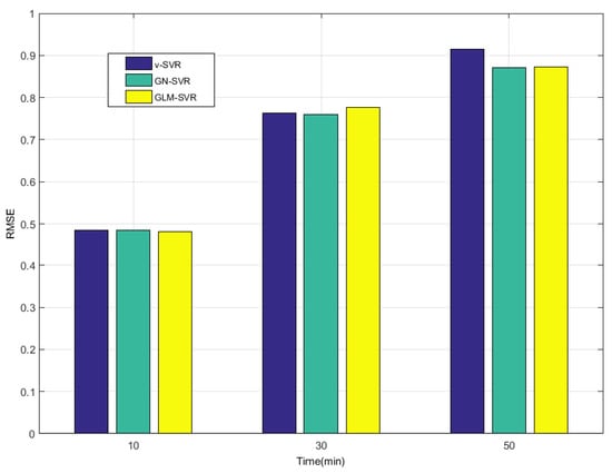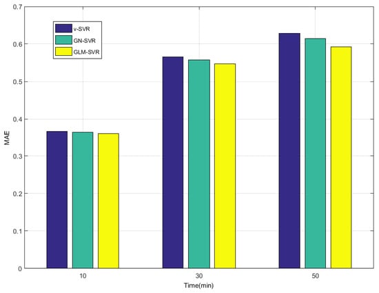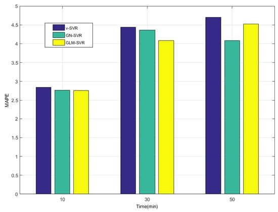 From Table 1, Table 2 and Table 3 and Figure 5, Figure 6, Figure 7, Figure 8, Figure 9, Figure 10 and Figure 11, in most cases, it can be concluded that the error calculation of model GLM-SVR is better than that of models -SVR and GN-SVR. As the prediction horizon increases to 30 min and 50 min, the errors obtained by different models rise and the relative difference decreases. However, as can be seen from Table 1, Table 2 and Table 3, the Gauss-Laplace mixture noise model is slightly superior to the classical model in terms of all indicators: MAE, MAPE, RMSE, and SEP.