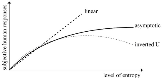 There are many studies in the literature analyzing the relationship between the measurable complexity, disorder, diversity, uncertainty, and entropy amounts of various stimuli and subjective assessments based on personal like or preference. Berlyne [2,3,4] conducted the pioneering work investigating human responses to the complexity of concrete or abstract stimuli. Berlyne [2] theorized that positive subjective feedback was related to the level of stimulation created by the physical features of the stimulus. Stamps [14] argued that linear, asymptotic, quadratic (inverted U) relationships could be observed between subjective human responses and the level of entropy (Figure 1).