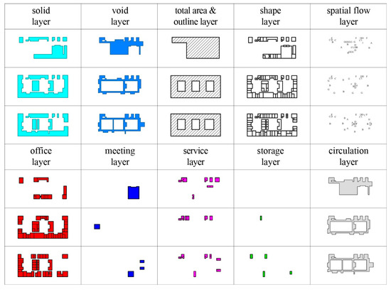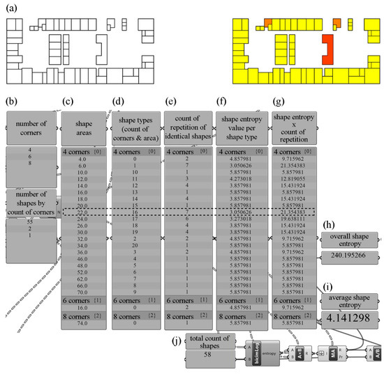 To measure and compare the entropy values of different buildings meaningfully, they should be represented within the same language. In Section 3.1.2, it was determined how the selected factors are represented with layers, shapes, and letters. Later, physical properties of buildings were interpreted on a computer by using Grasshopper.