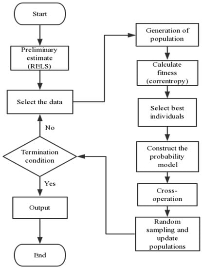 With determined delay and order, the parameter of the system model needs to be identified. The recursive extended least square (RELS) algorithm [] is used to estimate the system parameters and noise distribution preliminarily, then the mixture correntropy criterion-based EDA is chosen to estimate the parameters of the system and the distribution of noise more accurately. Once the PDF of the noise is obtained, an accurate performance evaluation index is provided.