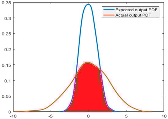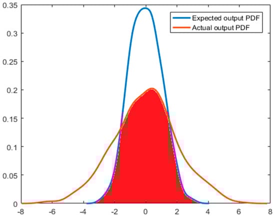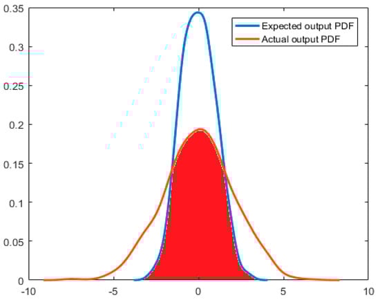 As shown in Figure 3, for a system with a known expected output, the coincident area in the actual output PDF and the expected output PDF can be used as the index of system performance evaluation, which is the red area in the figure. The global integral of PDF is 1; therefore, the result of this performance evaluation index is equal to the value of the coincident area between the actual output PDF and the expected output PDF. That is: