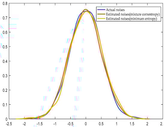 As the mixture correntropy is combined in the improved EDA, the translation invariance can be avoided. After obtaining the corresponding PDF, the system parameters and noise estimation distribution are obtained, the benchmark entropy and the performance of the system can be calculated according to Equations (10) and (11). Due to the simple calculation of the mixture correntropy, the system performance assessment index could be obtained quickly.