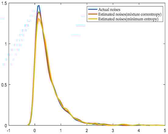 Compared with the prior system identification through the minimum entropy algorithm, the system parameter identification is more accurate with the improved EDA when the value of the mixture correntropy is larger. The more accurate the system parameter identification, the closer the noise estimation distribution to the actual distribution. The calculation speed is fast, and the iteration process of the improved EDA is faster than that of the prior system identification using the minimum entropy algorithm. Table 1 shows that when the disturbance is subject to a normal distribution and exponential distribution, the identification of the mixture correntropy produces the same or even more accurate results than the identification of the minimum entropy. The time required to obtain the evaluation index is also short. When the number of data increases, the required time clearly increases. The maximum value of the PDF of the error is fixed at e = 0 with the index of the mixture correntropy without adding a constraint to the mean.