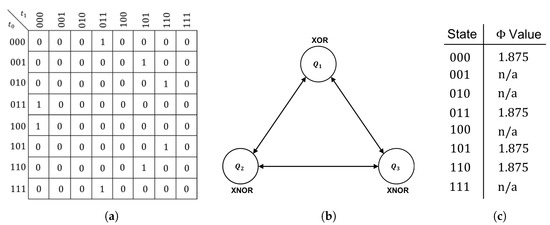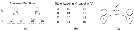 The second preserved partition must evenly split each block within in half. Letting we have , , , and . At this stage, it is trivial to verify that the partition is preserved because each block is comprised of only one state which is guaranteed to transition to a single block. As with , the logic gate for the second coordinate () is specified by the way the labeled blocks of transition. Namely, we have , , , and . Note that the transition function is completely deterministic given input from the first two coordinates (as required) and is given by . This implies is an OR gate receiving input from both and .