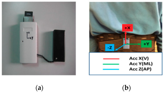 In this experiment, a triaxial accelerometer (RD3152MMA7260Q; Freescale Semiconductor-NXP, Astin, TX, USA; sampling rate 45 Hz) was placed on the subject’s back at vertebrae L3–L5 during the 3MTUG test (see Figure 1). This position is the centre of gravity of the human body, and most research [7] on fall-risk assessment has used this position. The X, Y, and Z axes were aligned with the vertical (V; up: +, down: −), mediolateral (ML; right: +, left: −), and anterior-posterior (AP; forward: +, backward: −) directions, respectively.
