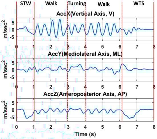 Examples of acceleration signals obtained from a sensor during 3MTUG test (sixth-order Butterworth filter, low-pass filtered at 3 Hz), including four segments (Sit-to-Walk (STW), Walk, Turning, and Walk-to-Sit (WTS)).
