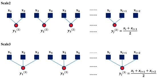 The “coarse-graining” process is based on the scale factor of the segment windows, calculating the average of the data points for each segment window and forming a new time series, called the coarse-grained time series (see Figure 5). Each element of the new coarse-grained time series, , is calculated according to