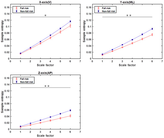 Triaxial MSE curves for overall TUG. Multiscale entropy (MSE) curves of entire activity data of TUG derived from elderly subjects at risk of falling and not at risk for scale factors ranging from 1 to 6. Values are presented as means ± standard errors. The horizontal black lines and asterisks indicate the scales with significant differences in MSE between fall-risk and not-at-risk subjects, where * denotes p < 0.05 and ** denotes p < 0.005 based on the independent-sample t-test.