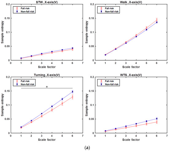 - For the X-axis (V) shown in Figure 7a, the MSE curves of the Turning segment clearly not only have higher entropy for the not-at-risk subjects but also offer better classification performance (p < 0.05) compared to the other segments. This is consistent with a previous study [28], which noted that turn-based features are important predictors because they contain useful biomechanical information that can improve the prospective fall-risk classification for healthy elderly people. In the other segments, the MSE curves show a nonsignificant difference between the two groups.