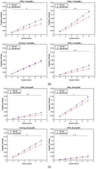 - For the Y-axis (ML) shown in Figure 7b, except for the Turning segment, the other three segments show a significant distinction (p < 0.05) between the two groups. In the Walk segments, the MSE curves show the gait complexity of swaying left and right, which is supposedly related to the arms swing when walking. Because of the walking duration, an arm swing is associated with postural stability [29] and can enhance gait stability [30]. Therefore, the MSE curve of the not-at-risk among the elderly is higher. In the STW and WTS segments, the MSE curves showed that the elderly subjects at risk of falling have lower complexity. Weiss et al. indicated that the ability to perform the STW and WTS subtasks are largely dependent on lower extremity strength [18]. Furthermore, Hausdorff et al. mentioned that the lower extremity function was significantly different among the fallers than among the non-fallers [31]. Thus, we can speculate that the low dynamic complexity of STW/WTS subtasks is associated with weaker, lower extremities.