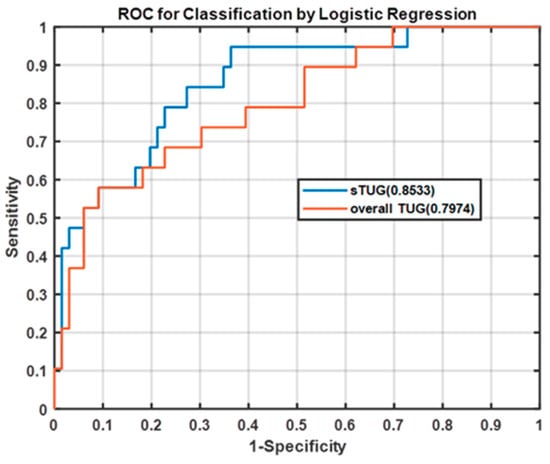 Through the logistical regression analysis with significant features, the performance of classification, such as AUC, can be obtained, which was compared and taken as a performance metric of the regression model in overall TUG and sTUG (see Figure 8).