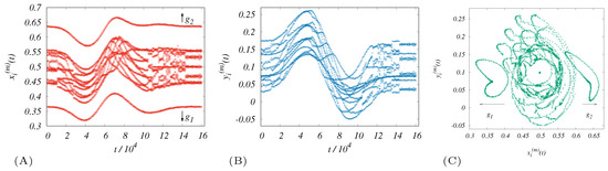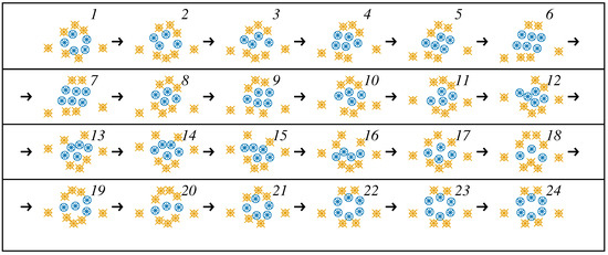 For example, the extra terms are presumed to occur between the selected drones and the points representing a pair of terrestrial (ground) immobile stations. The effects have been included in the modeling, taking into consideration the influence of two base stations , . Clearly, with a sufficient strength of , the robotic movement zone becomes restricted, which means that “soft” or “elastic” bonds are formed.