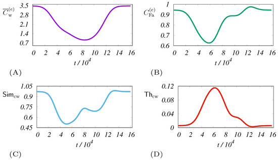 Analysis of simulated swarm response dynamics when the combination of disaster and wind causes a swarm shift. The system approach is used. The panels show dynamics of for the systemic alternatives { and }, which are shown sequentially in panels (A–D). The calculation uses the same parameters as in the case of Figure 3. If the parameters are of interest to the reader, please see also Table 1 and Table 2.