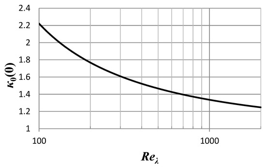 emphasizing—as above—that the explicit estimate given in the last expression is only given for illustration purposes and it is not valid for Reynolds numbers ~104 and larger. The magnitude and the trend of the dependence of the small distance κ0 on the Reynolds number is given in Figure 2: It apparently approaches asymptotically the value 1, although recent analysis [20] suggest that the flatness factor may reach a (finite) universal value in that limit, hence κ0(0) might approach a universal value, somewhat above unity.