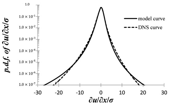 Continuous line: The model probability density function (PDF) of the normalized (longitudinal) velocity derivative for Reλ = 675, as it follows from Equations (61), (63), (29). Dashed line: The corresponding DNS data for Reλ = 675 [5].