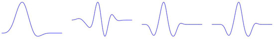 The pseudo-spline of type I, with its corresponding quasi-affine tight framelets generated by using of order , is depicted in Figure 2.