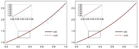 In Table 1 and Table 2, the error for different values of n and the numerical values of the exact and approximated solution when are computed, respectively. Some illustrations for the graphs of the exact and approximate solutions and the error are depicted in Figure 4 and Figure 5.