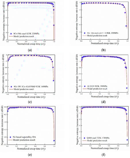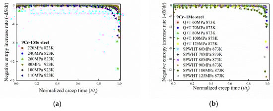 To investigate the increase rate of entropy in the creep process, a wide variety of creep experimental data for metals and alloys from literature were adopted [,,,,,,,,,]. Detailed experimental data sources are listed in Table 1 and summarized as follows: Creep tests for 9Cr–1Mo steel were performed at different temperatures (500 °C, 550 °C, 600 °C, and 650 °C) under various stress levels from 80 MPa to 320 Mpa by using a uniaxial-load creep test frame [,]. Creep tests for 9Cr–3W–3Co–1CuVNbB were performed at different temperatures (625 °C, 650 °C, and 675 °C) and stress levels (120–220 MPa) by using creep machines (RDJ 50 CRIMS) []. Creep tests for aluminum alloys [,] were adopted to verify the proposed model. Creep tests for Bar 257 were performed at 650 °C with a stress range from 70 MPa to 100 MPa []. Creep tests of Ni-base superalloy were performed at different directions and heat treatments []. Creep tests of Q460 steel were carried out at nine temperatures in the range of 300–900 °C and at various stress levels ranging from 13 MPa to 509 MPa []. Constant load creep tests of Co–Cr–Mo alloy were conducted at a temperature range of 650–800 °C and a stress range of 240–330 MPa []. The creep samples of DZ125 were machined such that the applied stress is along the [001] orientation []. The creep entropy increase rate was determined by Equation (7). The cumulative plastic strain rate was obtained by taking the slope of figures, which contains two coordinate axes: Creep strain and creep time. Other parameters were determined in the previous research []. The negative entropy increase rate (−dS/dt) with normalized creep time (t/tf) for materials at different temperatures and applied creep stresses are shown in Figure 1.