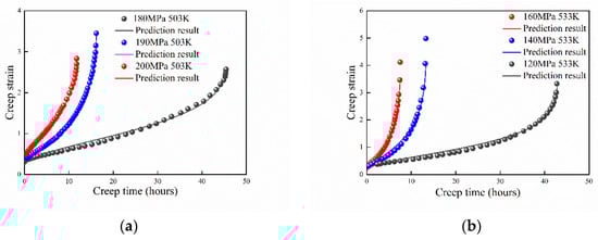 Prediction results of Al 2124 at (a) 503 K and (b) 533 K.