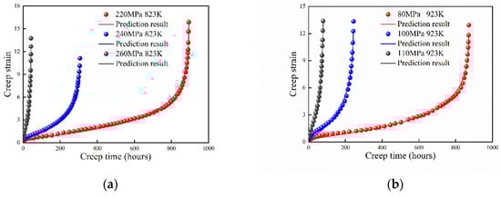 Prediction results of 9Cr–1Mo steel at (a) 823 K and (b) 923 K.