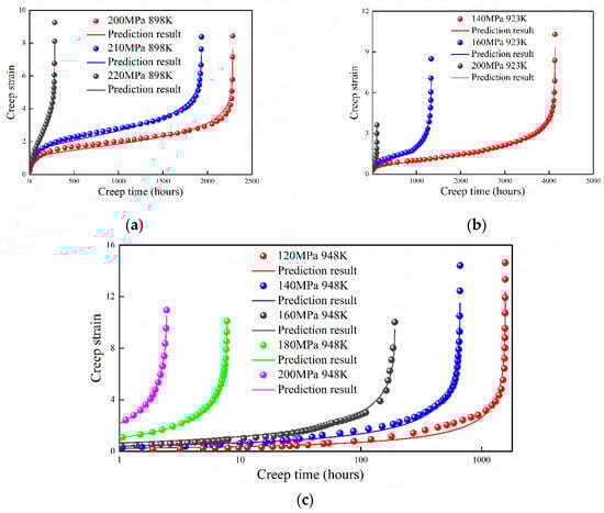 Xiao et al. [] systematically investigated the creep behavior of 9Cr–3W–3Co–1CuVNbB martensite ferritic steel for a temperature range of 898 K to 948 K under uniaxial tensile stress from 120 to 220 MPa. As shown in Figure 8, predictions of the proposed model agree well with the experimental data. For the creep behavior of 9Cr–3W–3Co–1CuVNbB steel under 898 K, the first creep stage has a relatively longer time compared with other temperatures. It is difficult for the traditional models to predict the creep strain under these circumstances (it only maintains a certain precision in the first or third stages) []. The predictions of proposed model agree well with the experimental data except under the applied stress of 120 MPa at 948 K. Considering that the proposed model is single-parameter, the accuracy of prediction is acceptable.