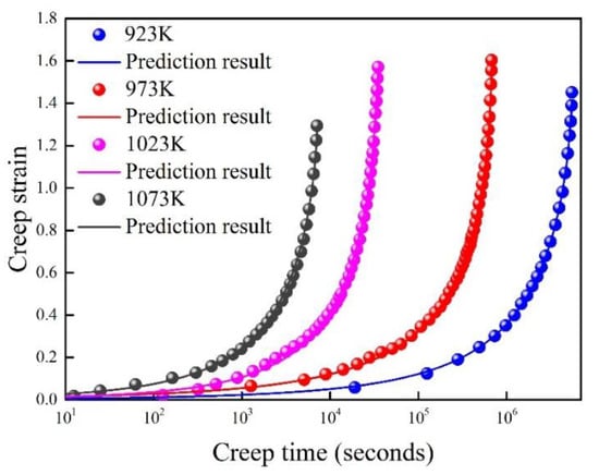 The creep behavior of Co−Cr−Mo alloy at different temperatures (923 K, 973 K, 1023 K, 1073 K) was investigated by Sun et al. []. The experiments were carried out at a constant applied stress (240 MPa). The theoretical prediction is compared with experimental data, as shown in Figure 10. The transverse axes is taken as logarithmic coordinates to make the difference of experimental data more obvious. Generally, the prediction results agree well with the experimental data.