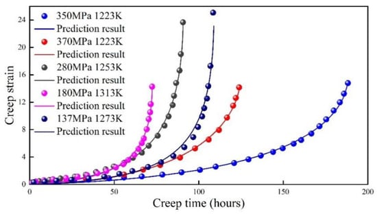 Prediction result of DZ125 super alloy at different creep stresses and temperatures.