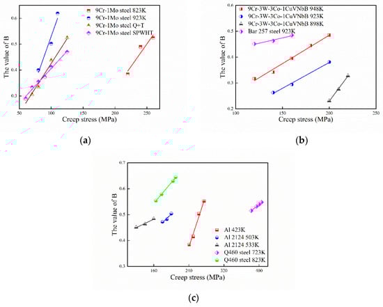 As shown in Figure 12, with increasing of the applied stress, the value of B also shows a near-linear increasing trend for different materials. In the current study, the value of B has a relative concentration range of 0.2~0.7 (maximum = 0.645 for Q460 steel at 210 MPa 823 K; minimum = 0.231 for 9Cr–3W–3Co–1CuVNbB at 210 MPa 898 K).