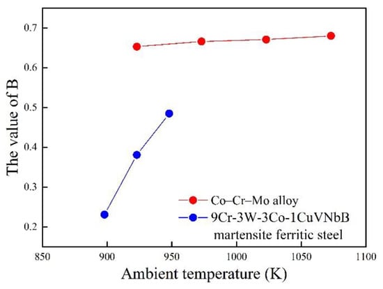 The relationship between B and temperature is shown in Figure 13. With the increase in temperature, the value of B also increases for 9Cr–3W–3Co–1CuVNbB and Co–Cr–Mo alloy. Although the relationship between B and temperature approaches linear for Co–Cr–Mo alloy, determination of an accurate relationship still requires more experimental data.