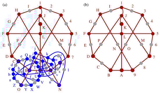 For a symmetric Kochen & Specker’s divided hexagon ([], Figure 6(ii)) MMPH 8–7, a subgraph of the KS set 117–118 [], shown in Figure 3a, we obtain . The contextuality of the set has previously been considered in Reference [].