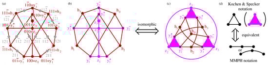 (a) An MMPH subgraph of Peres’ KS MMPH; (b) Yu-Oh’s reduction of (a); (c) Yu-Oh’s Figure 2 from []; (d) Yu and Oh adopted a mixture of Kochen & Specker notation []; Cf. (Figure 19 in the []), (the triangles in (c)) and MMPH notation (the circle in (c)).