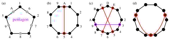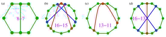 (a) Hexagon MMPH from the KS set 192(117)–118 (Figure 6(ii) in the []) where it appears in 15 instances; (b) a symmetric  of Peres’ MMPH with a non-diagonal ; (c) an asymmetric  of Peres’ MMPH with a diagonal  and ; (d) a constructed symmetric MMPH with a diagonal  and  but whose full scale version does not have a coordinatization.